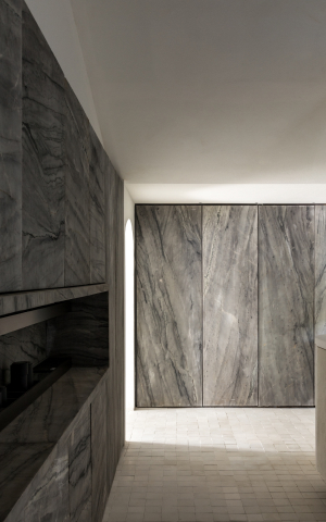 A sutil estrutura em alumínio deixa em evidência a espessura ultra compacta e toda a riqueza da pedra natural como o mármore, o limestone e o granito, que pode ser explorada em diferentes toques e texturas: polido, groove, anticato ou levigado.
